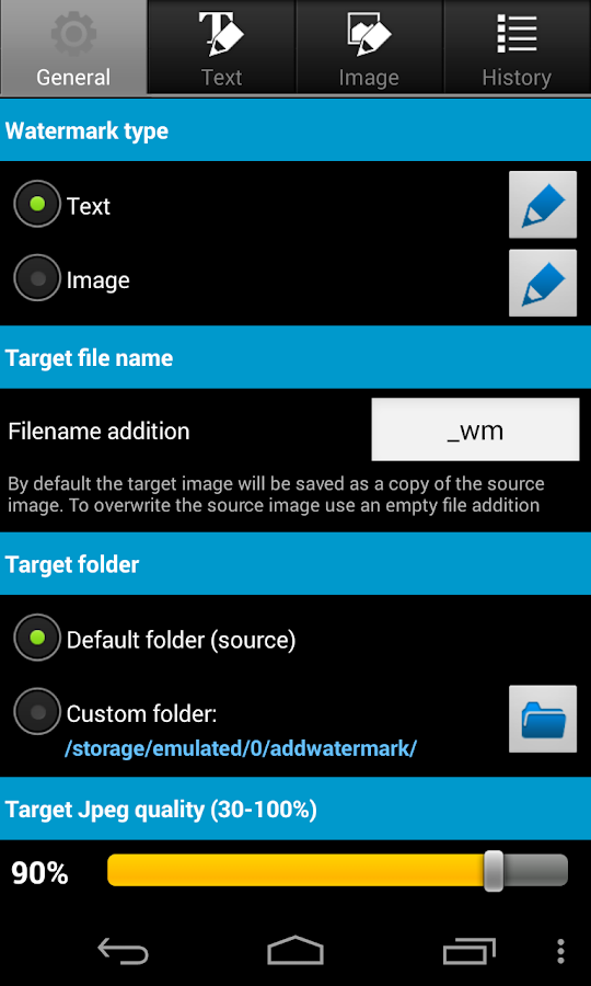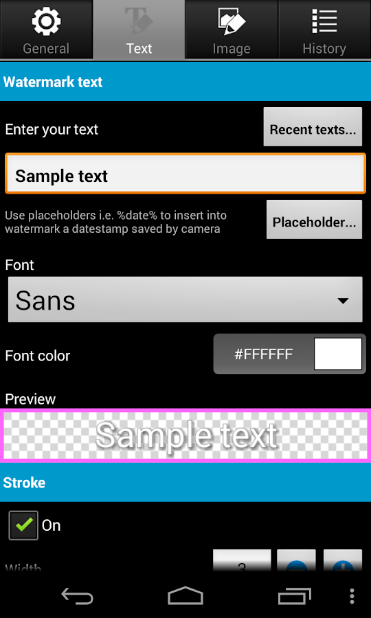 • To import custom fonts copy up to 20 TrueType or OpenType fonts to folder "addwatermark/custom_fonts" on your device.