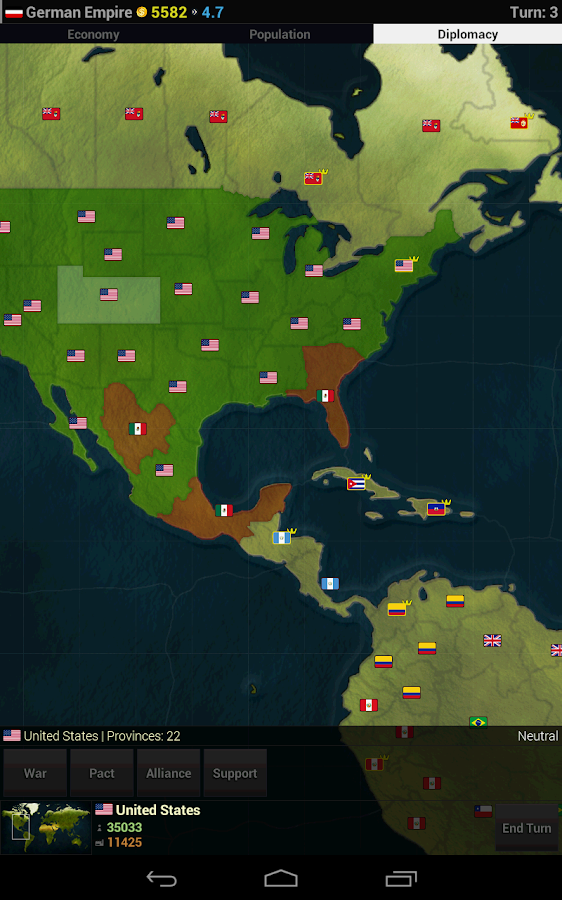 - Use the Economy and Population buttons to view each province’s Economy and Population values. Use the diplomacy button to view each province’s owner and engage in diplomacy (see Orders- Diplomacy View).