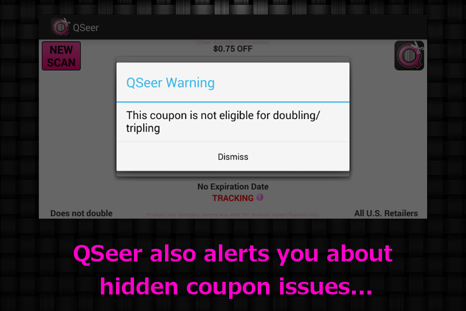 QSeer is a coupon barcode interpreter. QSeer only reveals the information that is encoded on a coupon without any moral judgment or redemption suggestions. QSeer is not designed to be used as a vehicle for the misredemption of any coupons. QSeer Users are advised to read our End User Licensing Agreement (EULA) for further details.