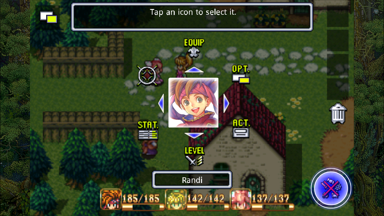 One of the most memorable elements of the Mana series is the Ring Command menu system. With the single press of a button, a ring-shaped menu appears on the screen, where players can use items, change weapons, and do a variety of other actions without needing to switch screens. This Ring Command menu system for which the Mana series is so well known was first introduced in Secret of Mana and has since appeared in most games in the series.