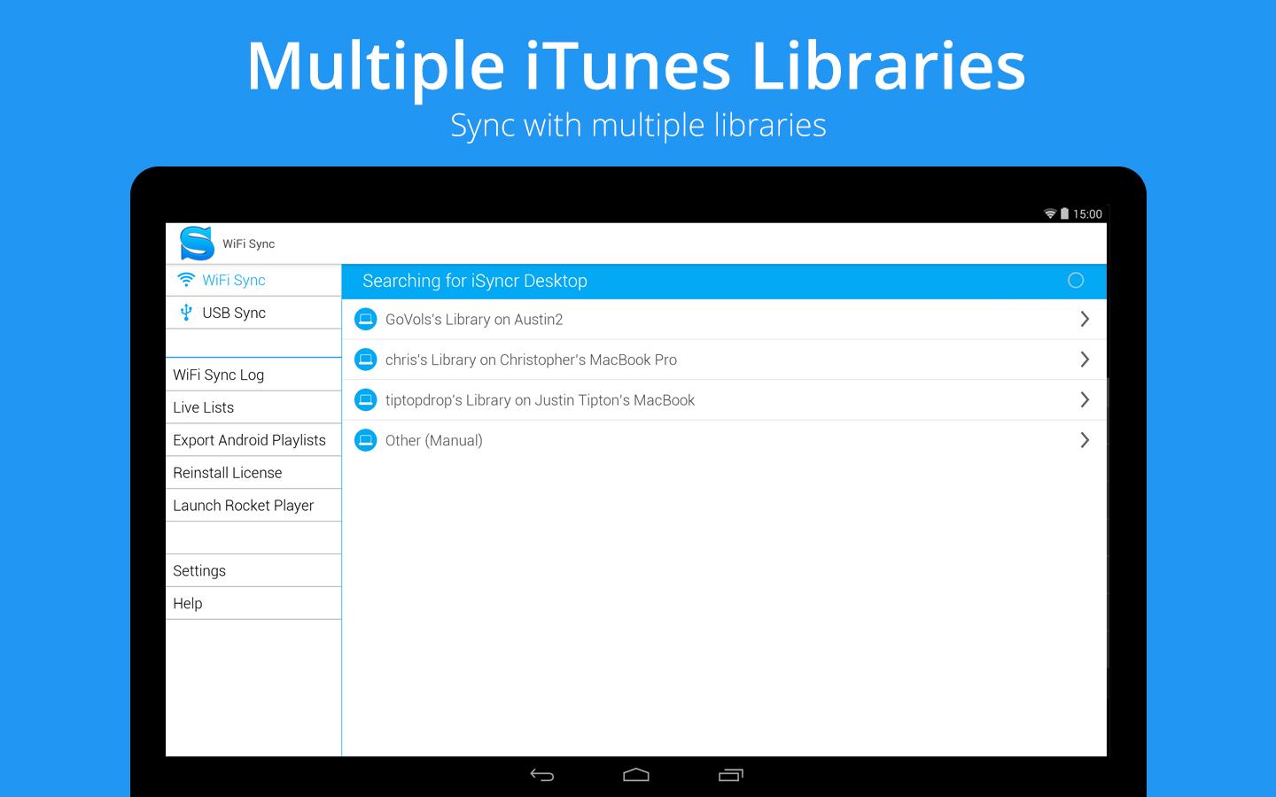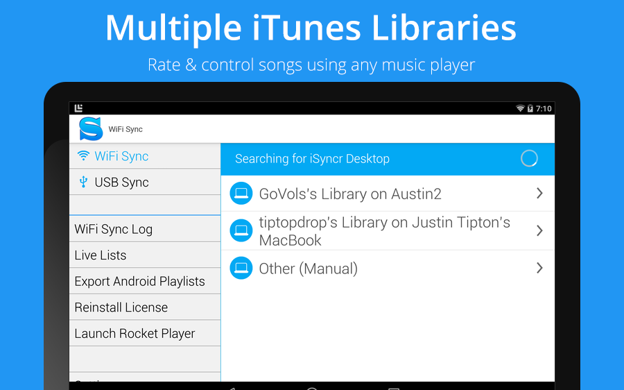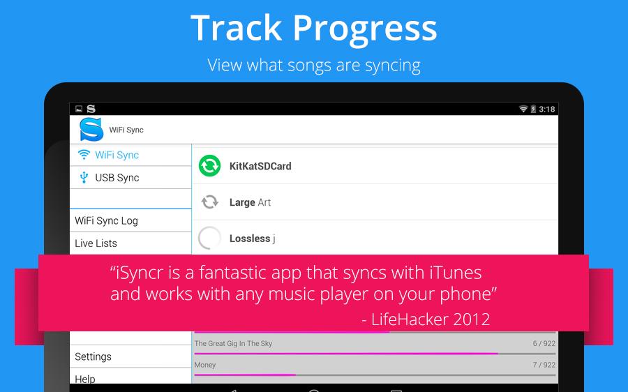 The pro version of iSyncr gives you unlimited song and playlist syncing. Sync your iTunes music library with your Android devices.