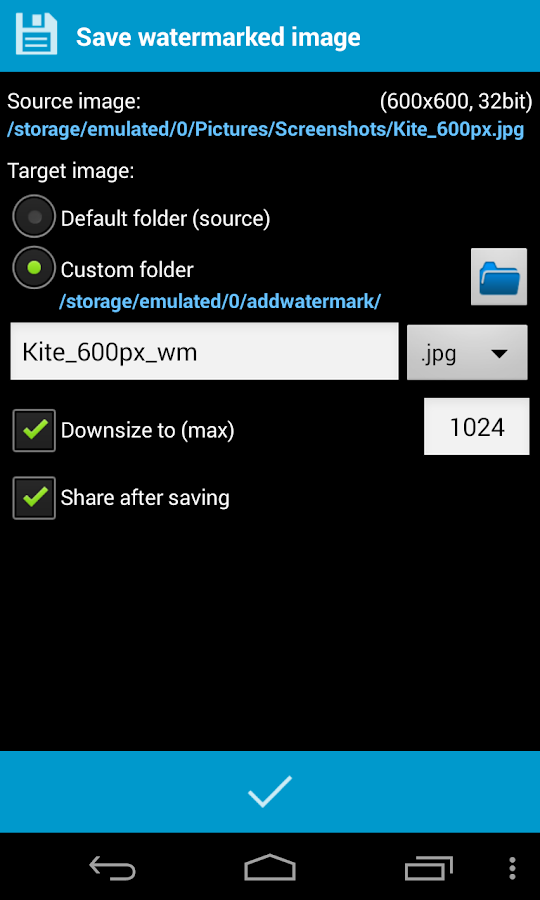 • To quick share a picture to Facebook, Twitter, Flickr etc. enable "Share after saving" in "Save Dialog". The related app must be already installed on the device.
