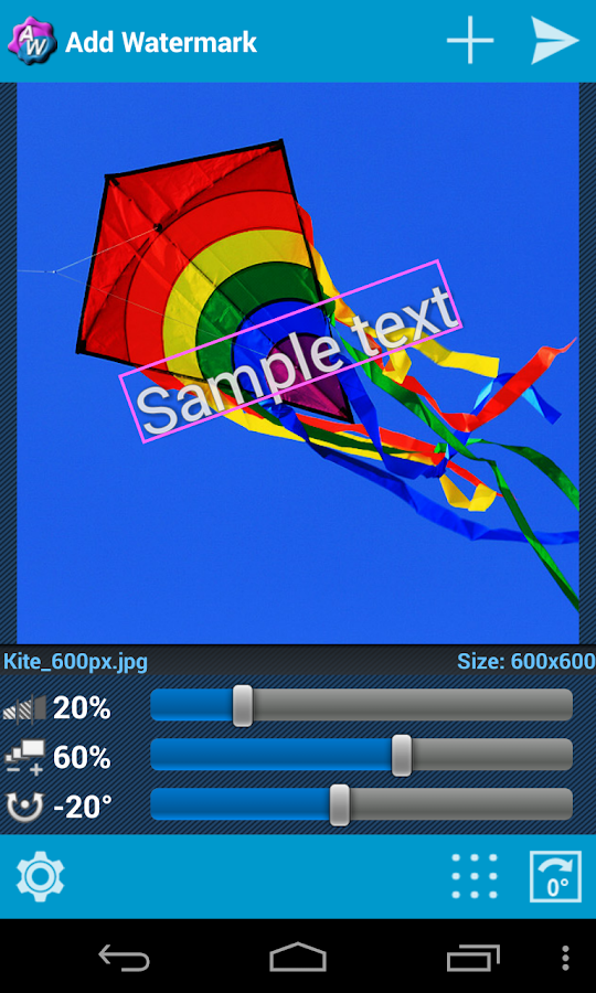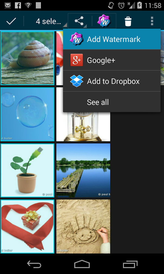 • To add watermark direct from Gallery or another app, use Send or Share command and select Add Watermark.