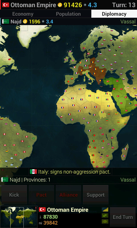 - Use the Economy and Population buttons to view each province’s Economy and Population values. Use the diplomacy button to view each province’s owner and engage in diplomacy (see Orders- Diplomacy View).