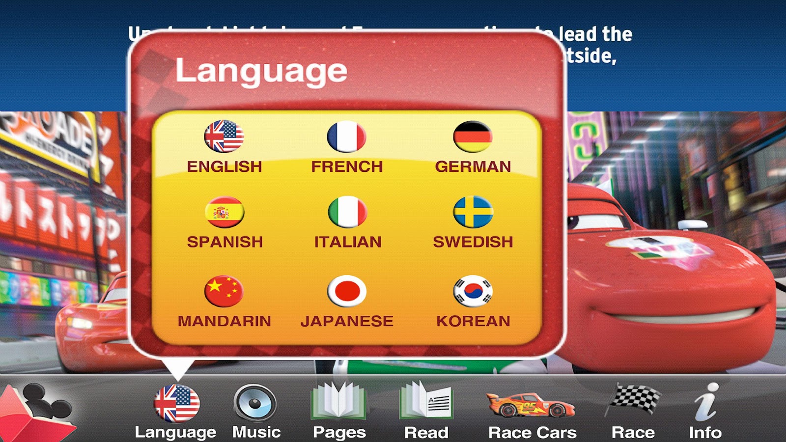 Start your engines! Read along as Lightning McQueen and the world’s top international racers power through the streets of Tokyo, Japan; Porto Corsa, Italy; London, England; and finally Radiator Springs in this original story!