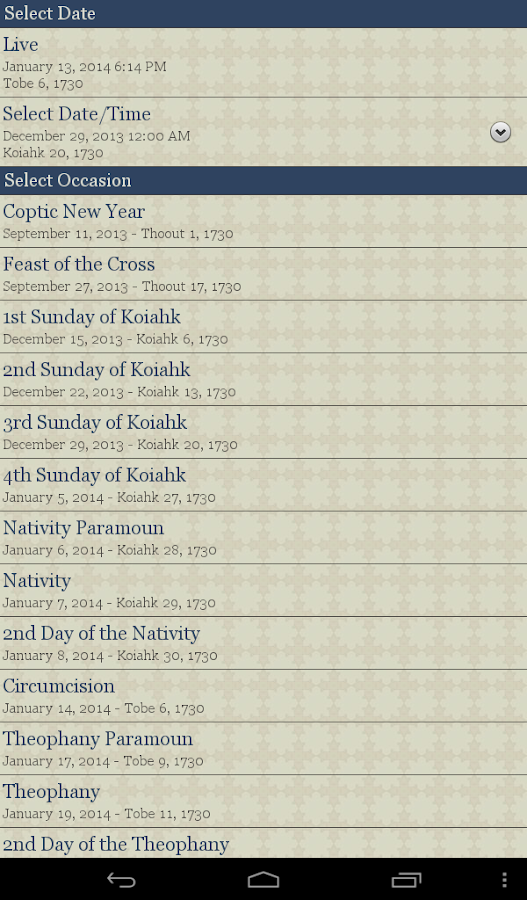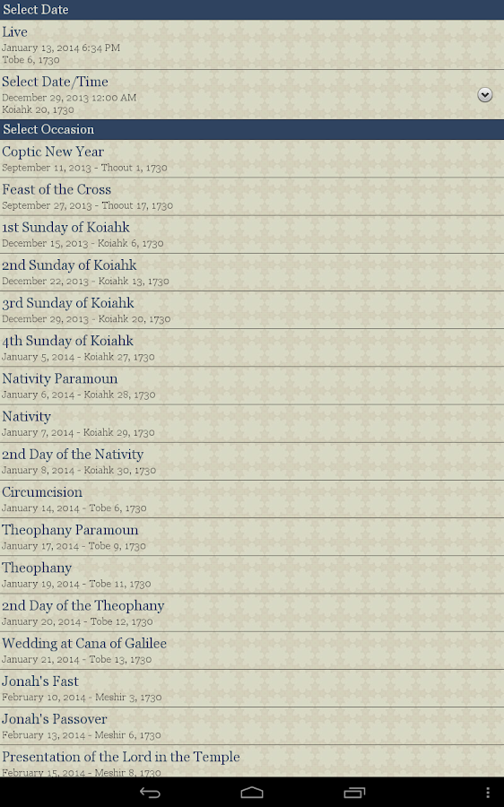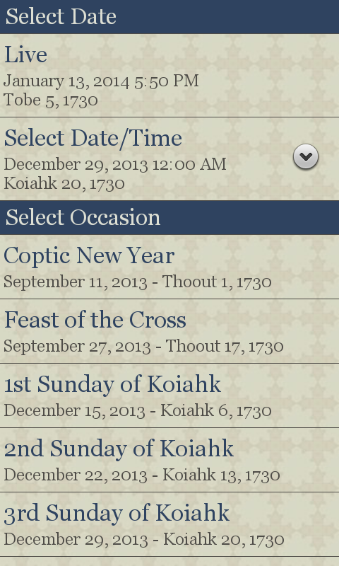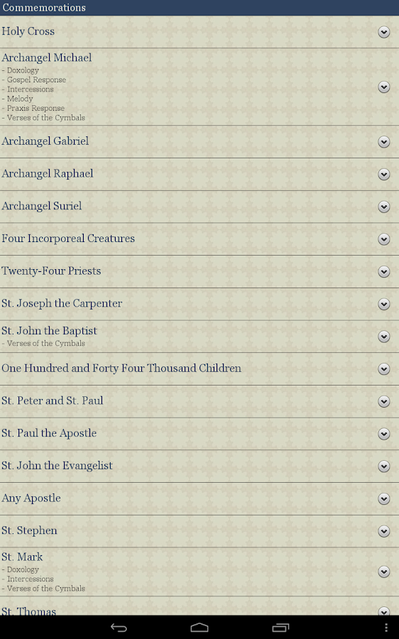 You may choose between different graphical themes as well as change the document text size. A presentation mode is also supported that allows you to project the content in your church for a complete experience. The application also allows you to control which saint or archangel commemorations will be shown in doxologies, hymns, responses, and other prayers for your church's intercessors.