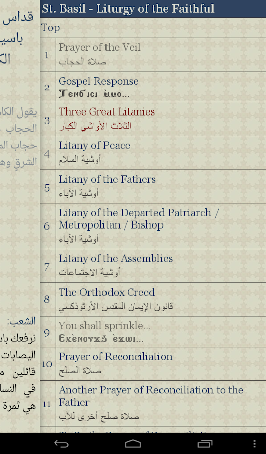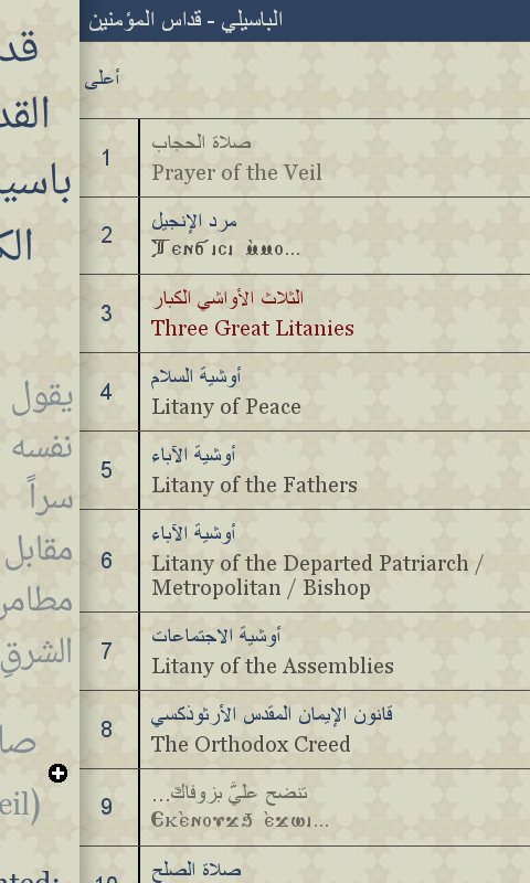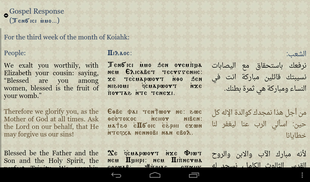 Coptic Reader can generate documents in a combination of English, Arabic, and Coptic and supports both English and Arabic as the application interface language. Coptic Reader is fully customizable and allows you to show/hide different liturgical roles (i.e., Priest, Deacon, and Congregation), inaudible prayers, rubrics/comments, and languages.
