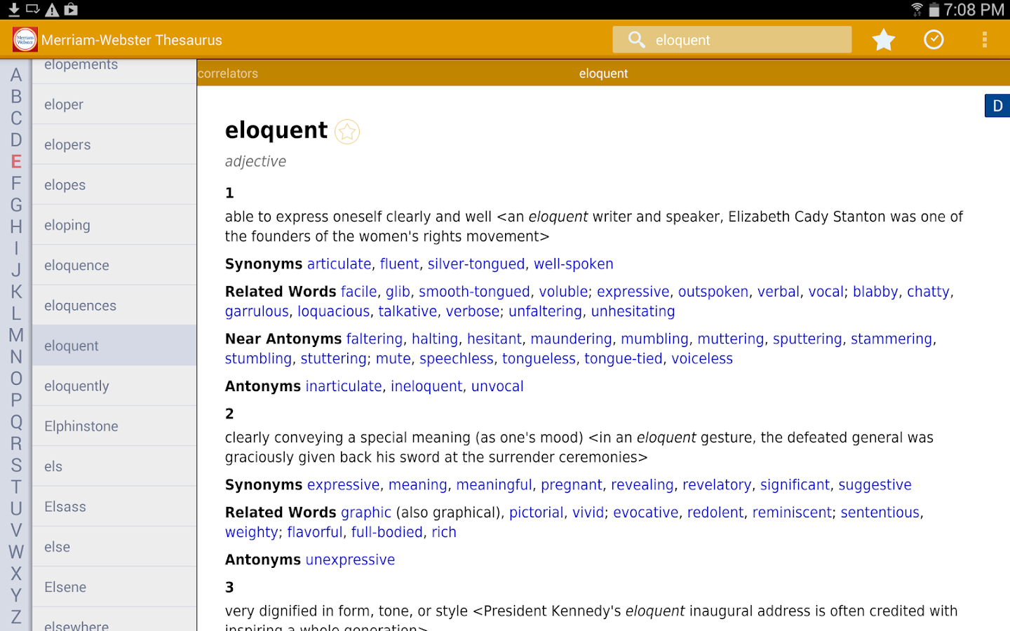 Offline access: You’ll have complete access to definitions and synonyms whether or not you’re connected. You will need a connection to view illustrations, hear audio pronunciations, and use voice search.
