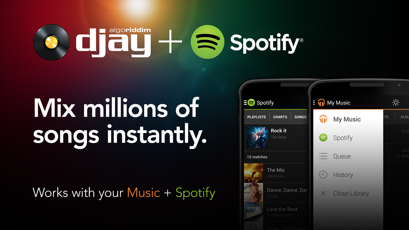 djay transforms your Android device into a full–featured DJ system. Seamlessly integrated with Spotify and all the music on your device, djay gives you direct access to mix your favorite songs and playlists instantly. You can perform live, record mixes on–the–go, or enable Automix mode to let djay create a seamless mix for you automatically. Whether you are a professional DJ or a beginner who just loves to play with music, djay offers you the most intuitive yet powerful DJ experience on an Android device.