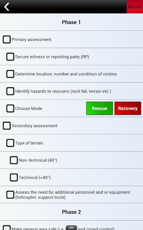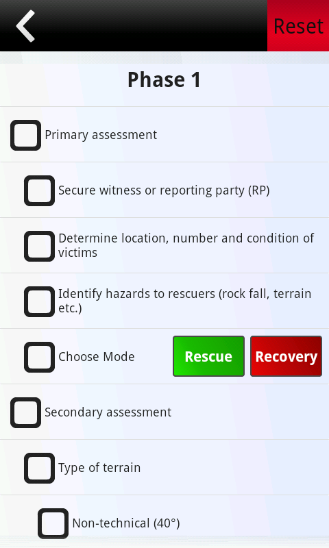 Interactive Command Checklists that include an elapsed time function to assist with training, as well as being a tool that helps rescuers lay the framework for safe efficient rescues.
