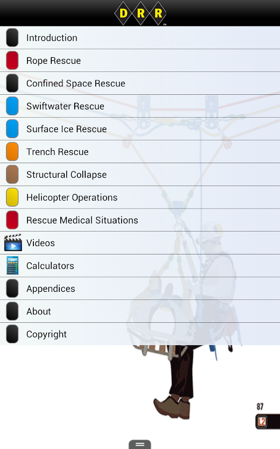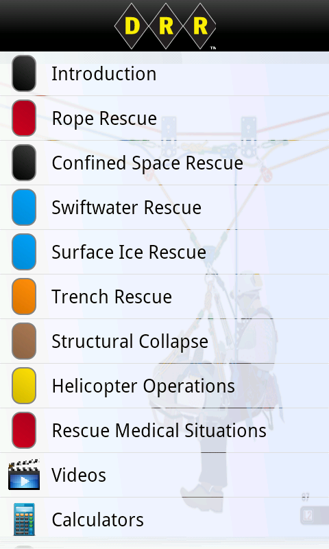 This app covers Rope Rescue, Technical Rescue, Swift Water Rescue, Mountain Rescue, Confined Space Rescue, Helicopter Rescue, Structural Collapse Rescue, Rescue Medical procedures, FEMA and NIMS ISC for disaster incident command.