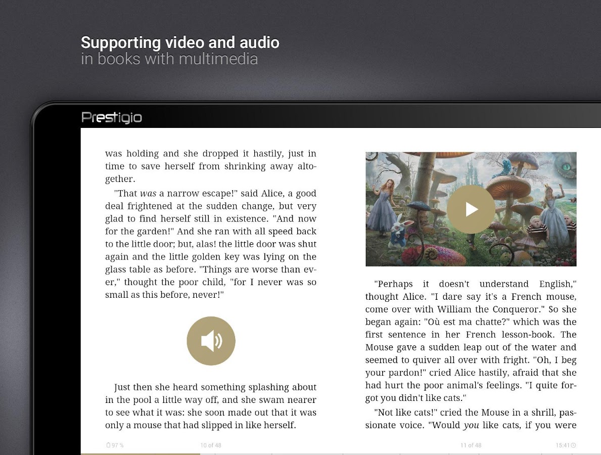 ☆ Prestigio ebooks reader is cool - book and text reading never been simpler - you can read text files in multiple formats including epub, html, fb2, fb2.zip, txt, pdf, mobi, epub3, djvu and multiple other text and audio book formats.