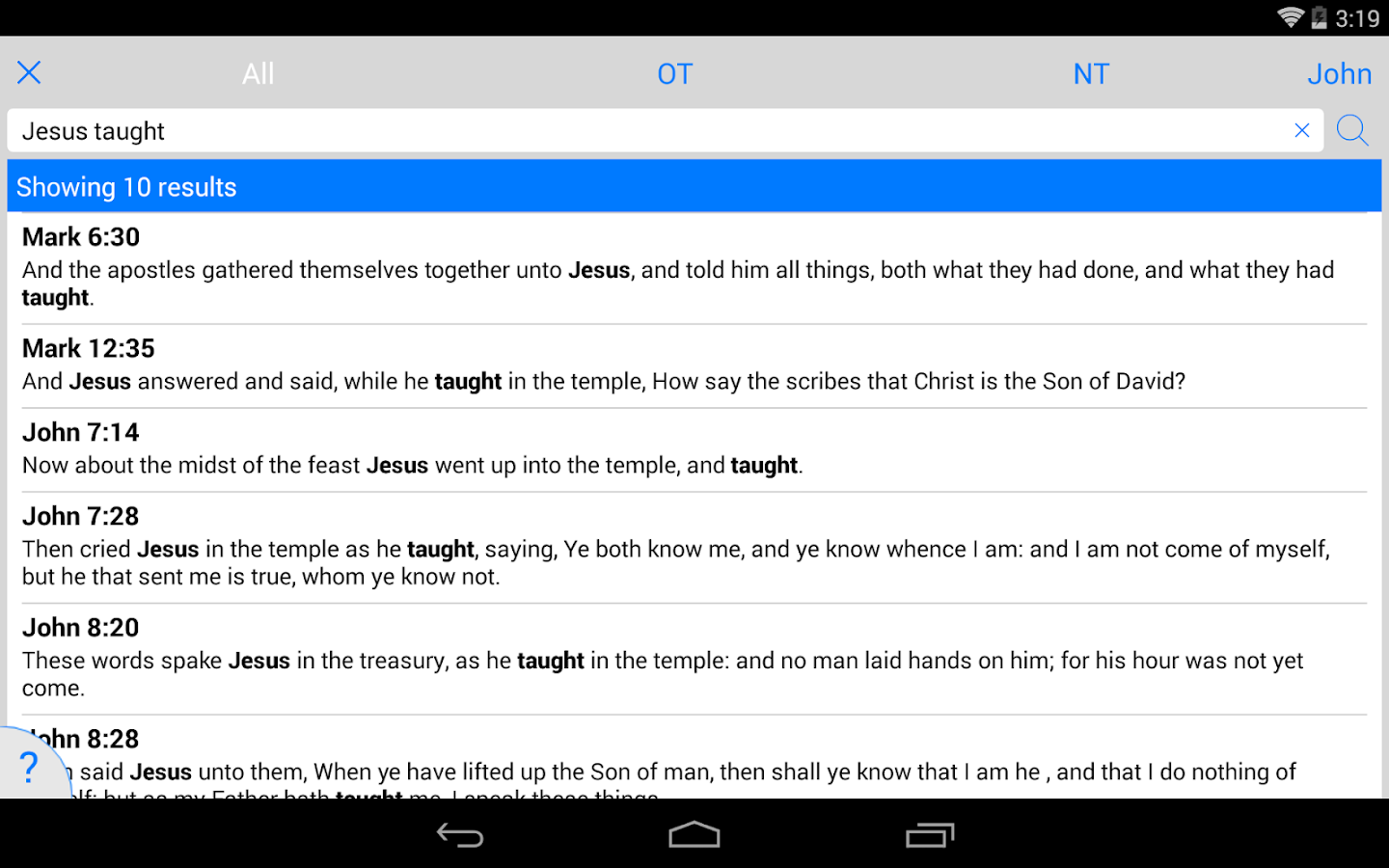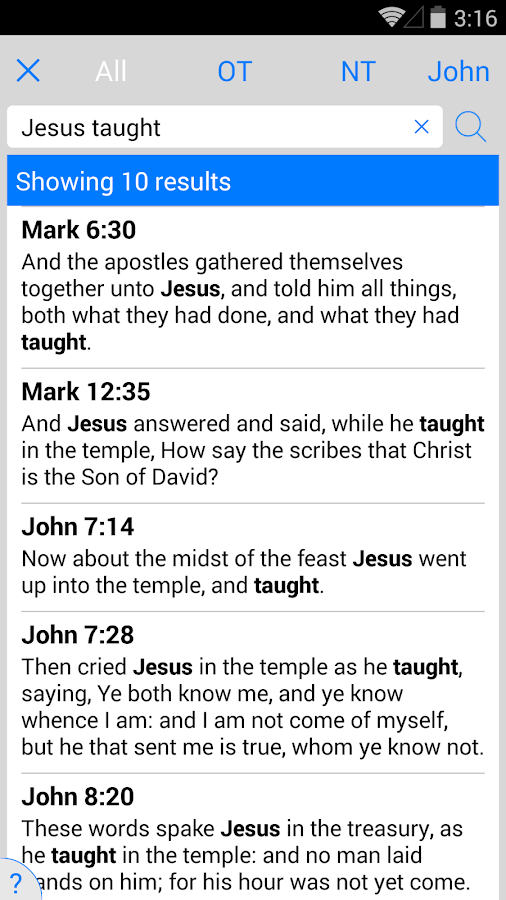 • Search the Old & New Testament to find verses containing the entered keyword