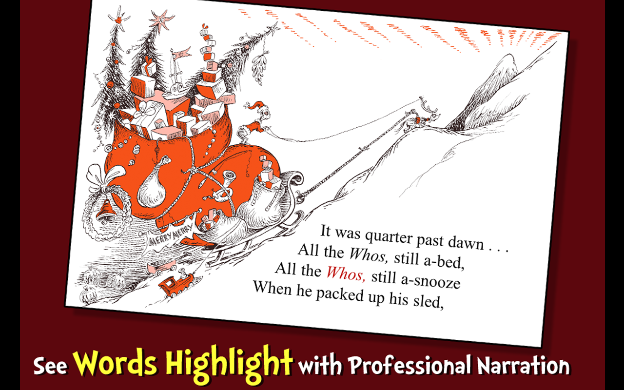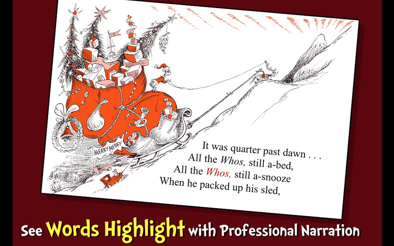How the Grinch Stole Christmas 1.50 is a Android App developed by Oceanhouse Media, Inc.. It is a Books & Reference kind of App with lots of features listed. This App already downloaded around 10,000 - 50,000 times from initial release. How the Grinch Stole Christmas requires your device to have Android 1.50 to open this App. This particular version of the App released with lot of bug fixes and performance improvements. You can go ahead and Download How the Grinch Stole Christmas 1.50 APK full version from the download page to install directly on your Android Device.