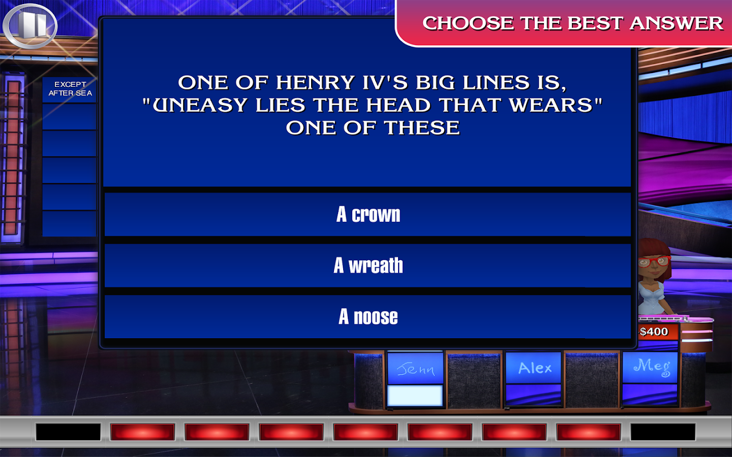 Test your knowledge with thousands of clues collected from the show’s very own writers. Hear Johnny Gilbert’s famous Jeopardy! introduction, step up to the podium and get ready for categories ranging from sports and pop culture to travel, world history and much more. Customize your own avatar in-game and use the interactive touch screen to write your name on the podium. Play quick games on the go in single player mode or challenge your family and friends via Pass and Play mode. Celebrate over 30 seasons of America’s Favorite Quiz Show®—download now and play today!