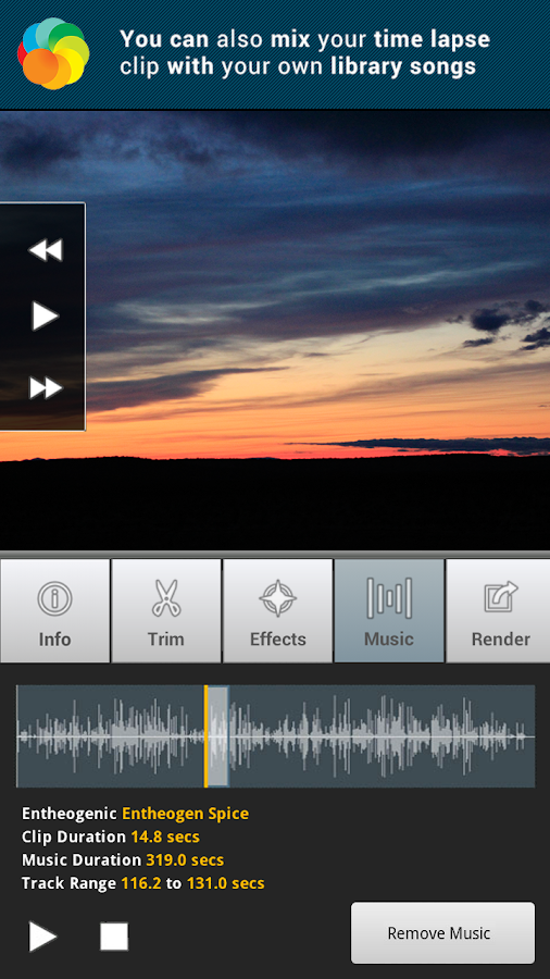 Lapse It has a UNIQUE and POWERFUL native render engine that allows you to create spectacular videos, it is blazing fast, robust, support audio and has a fully featured range of settings to apply.