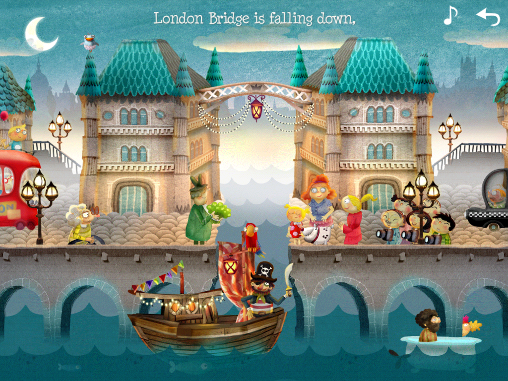 London is a busy town! Especially since the bridge has a gap. Tourists, a pirate and a parrot, a crocodile, a mermaid and a whale, a cab with a periscope; everything moves and can be touched while the little fox dances behind the windows of the towers.