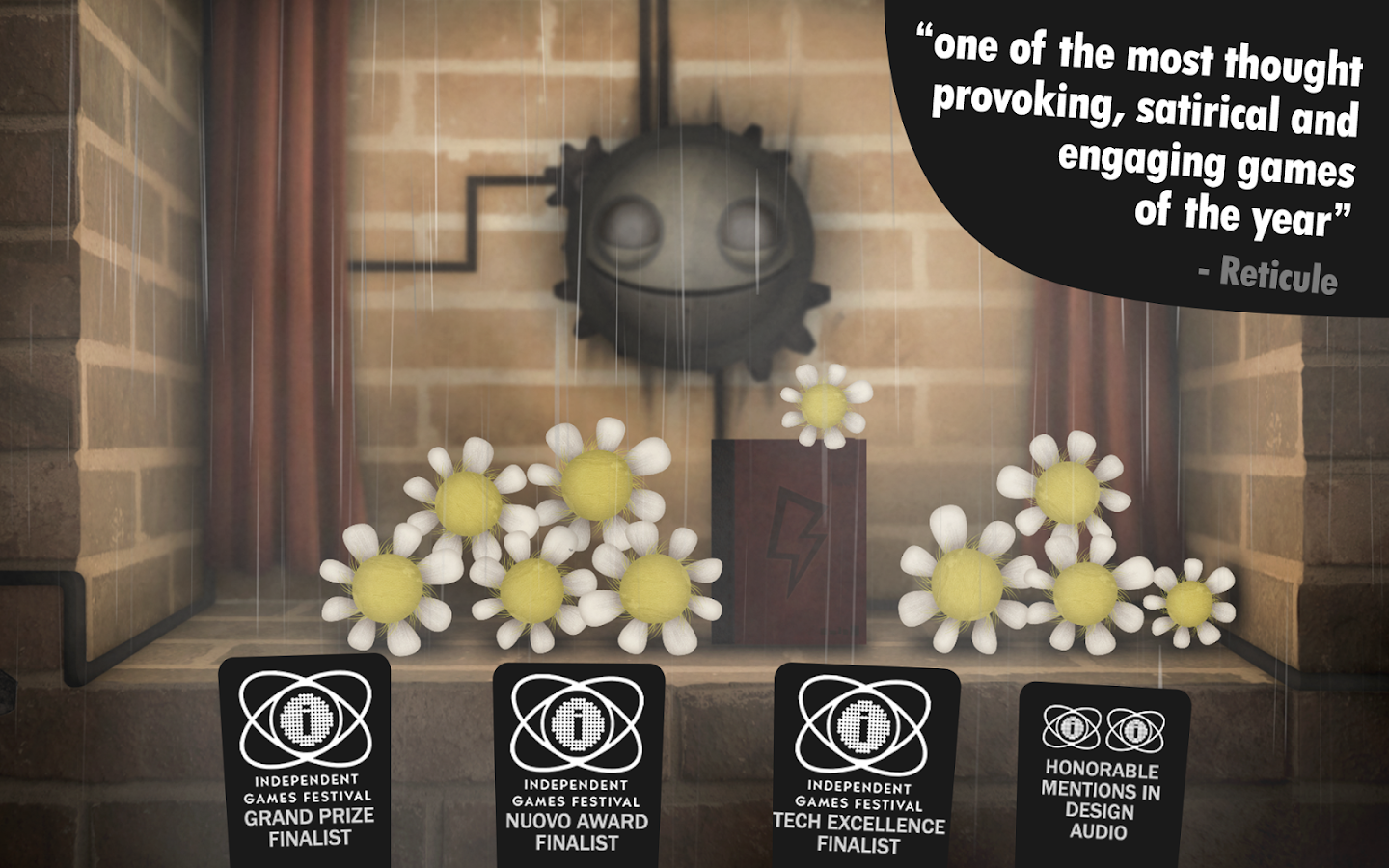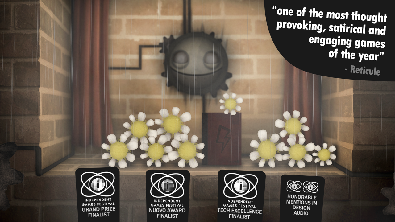 Nominated for IGF Grand Prize, Nuovo Award, Tech Excellence, with honorable mentions in Design and Audio.