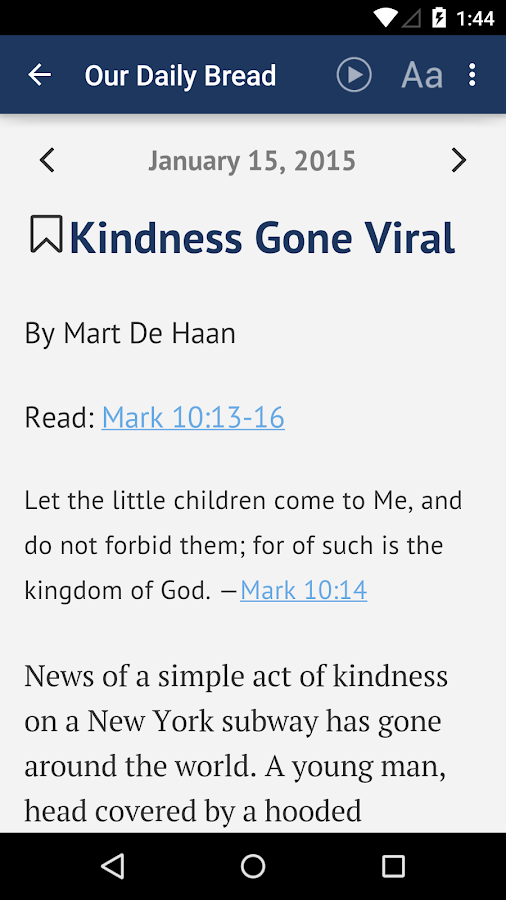 Our Daily Bread 2.6.1 is a Android App developed by Our Daily Bread Ministries. It is a Books & Reference kind of App with lots of features listed. This App already downloaded around 1,000,000 - 5,000,000 times from initial release. Our Daily Bread requires your device to have Android 2.6.1 to open this App. This particular version of the App released with lot of bug fixes and performance improvements. You can go ahead and Download Our Daily Bread 2.6.1 APK full version from the download page to install directly on your Android Device.