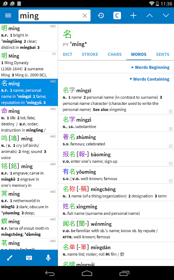 • Powerful search: look up words by Chinese characters, Pinyin (spaces/tones optional), or a combination, with support for wildcards and full-text search.