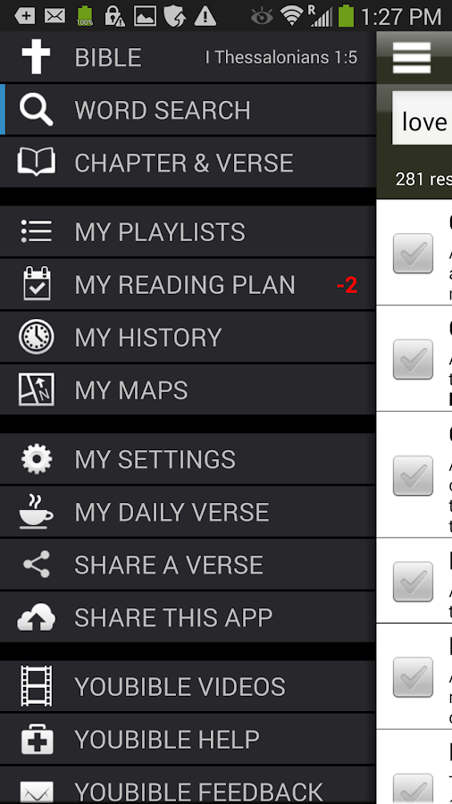 YouBible App includes many useful features (see below) and we also have mp3 AUDIO Bible downloads on our web site for laptops and mp3 players. These are self contained on your device and you need no internet connection to play them. So what Bible app is in your pocket.