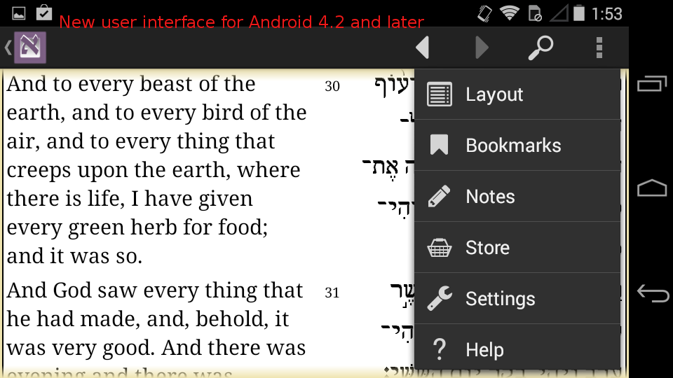 Tanach Bible is available for all Android versions. For users with devices running Android 4.2 or later, an entirely new user interface with many enhancements has been added. The new user interface includes more text views, a cursor for native editing in the search box, new icons, an improved help section with a table of contents and quick start guide, and more flexible navigation within the app.