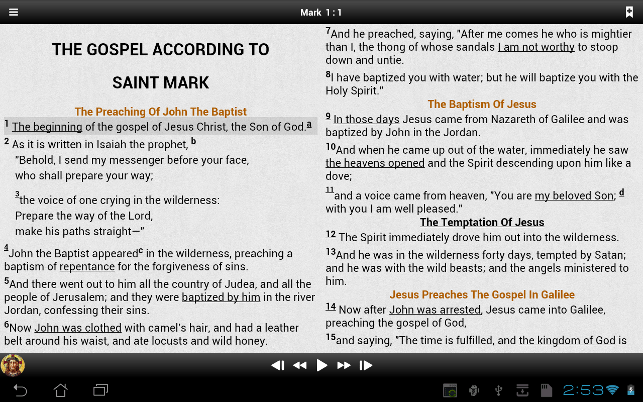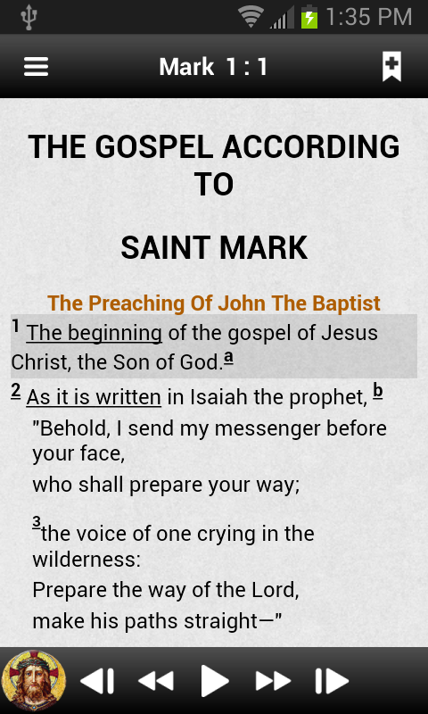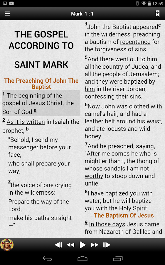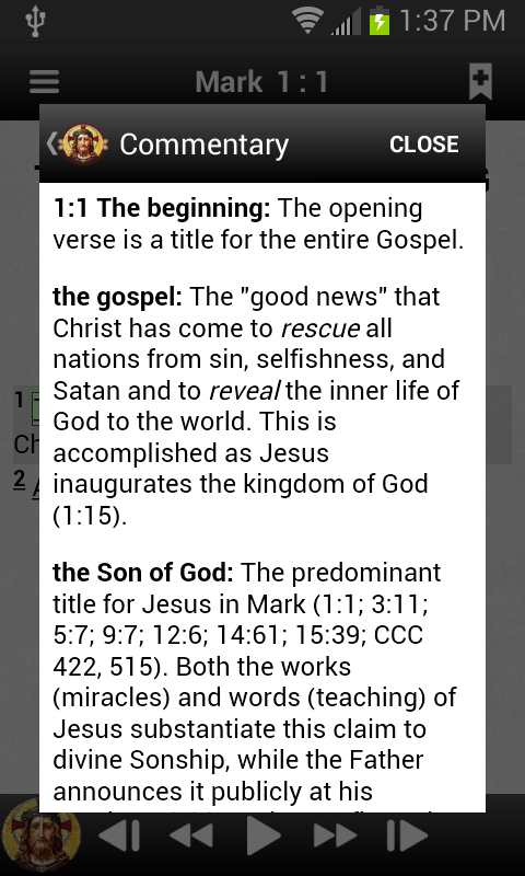 In addition to the complete RSV Second Catholic Edition Text (RSV-2CE), the app includes the audio for the Gospel of Mark and FREE selection from the Ignatius Catholic Study Bible for the Gospel of Mark. At any time you can purchase the full New Testament Audio and the full Ignatius Catholic Study Bible (New Testament and an ever-expanding list of Old Testament books), annotated by Dr. Scott Hahn and Curtis Mitch. The Ignatius Catholic Study Bible includes superb notes, essays, and commentary, as well as a doctrinal index.