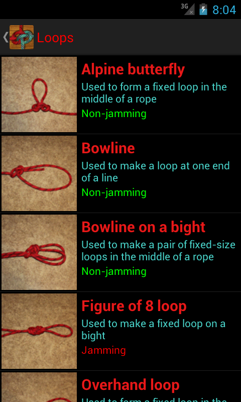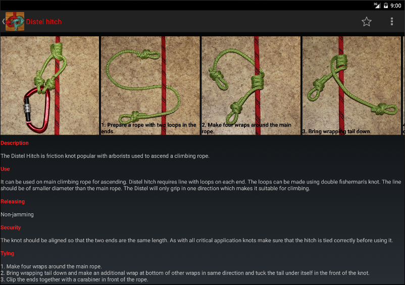Knots are categorized by type and each knot has a description and step by step instructions with pictures and guide on how to tie it.