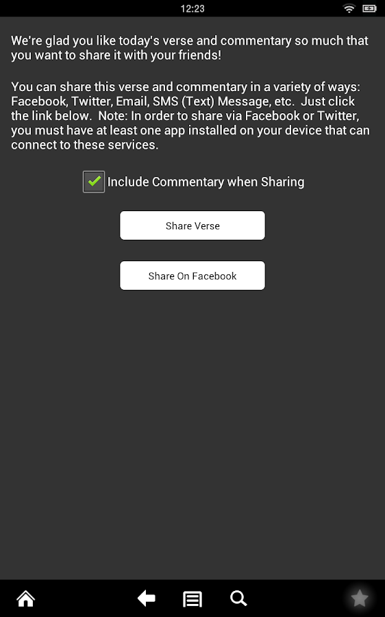 This version now includes the ability to sync Bookmarked Verses/Commentaries across multiple Android devices! This feature also works as a bookmark backup for when you get a new Android device. To enable this feature, simply press the menu button while in the 'View Bookmarks' screen, select 'Sync Settings' and create an account (or sign in using an account you created previously).