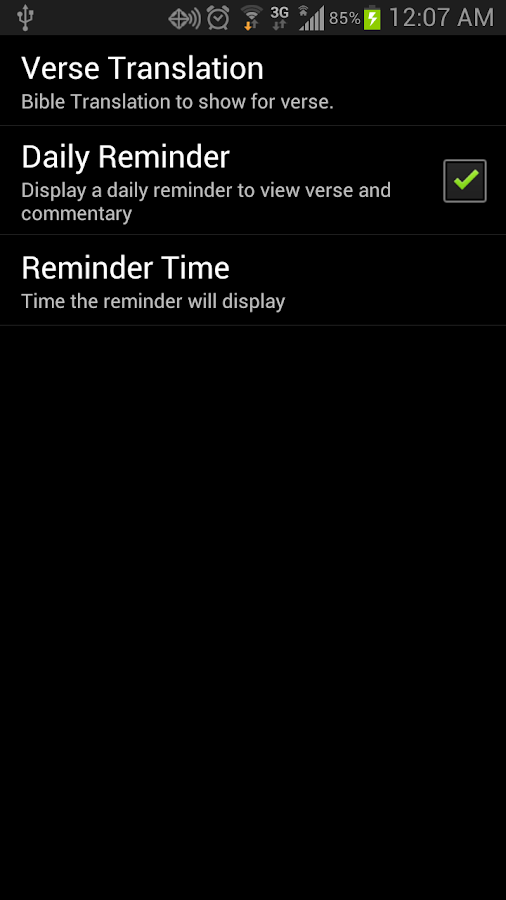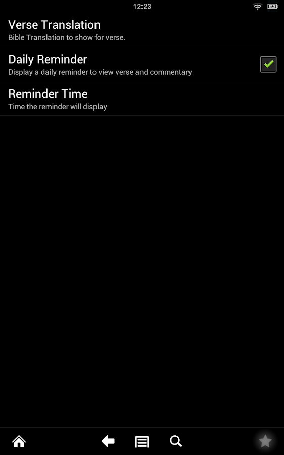 Verse-A-Day also provides a reminder feature to enhance your daily bible experience. This reminder feature can be configured to pop up daily reminders at a time of your choosing each day to help you remain consistent in the daily reading of bible verses.
