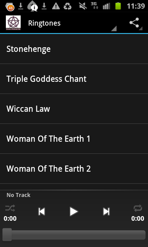 * Broad selection of Wicca, Pagan, Chants and Celtic Ringtones (to set ringtone: choose sound and press long to see options. You can all sound files as ringtone, notification sound or alarm)