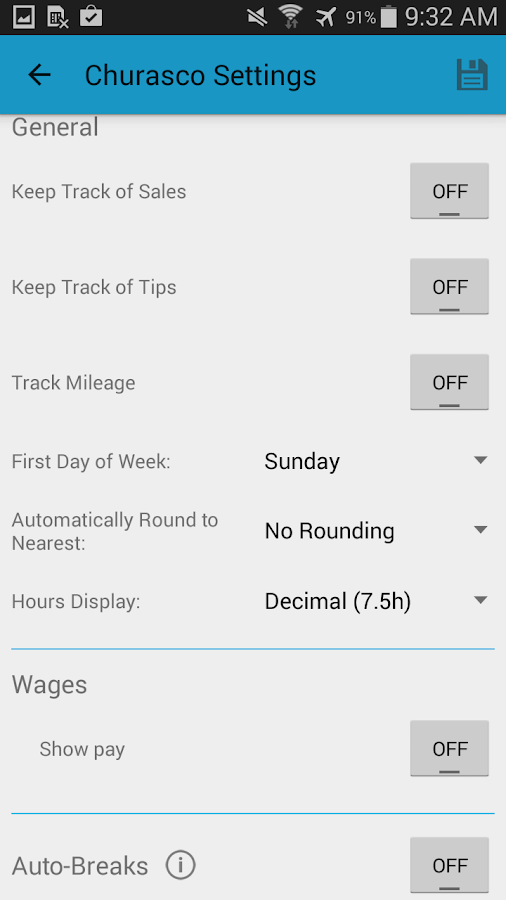 • Time saving features like automatic break deduction and pay period settings