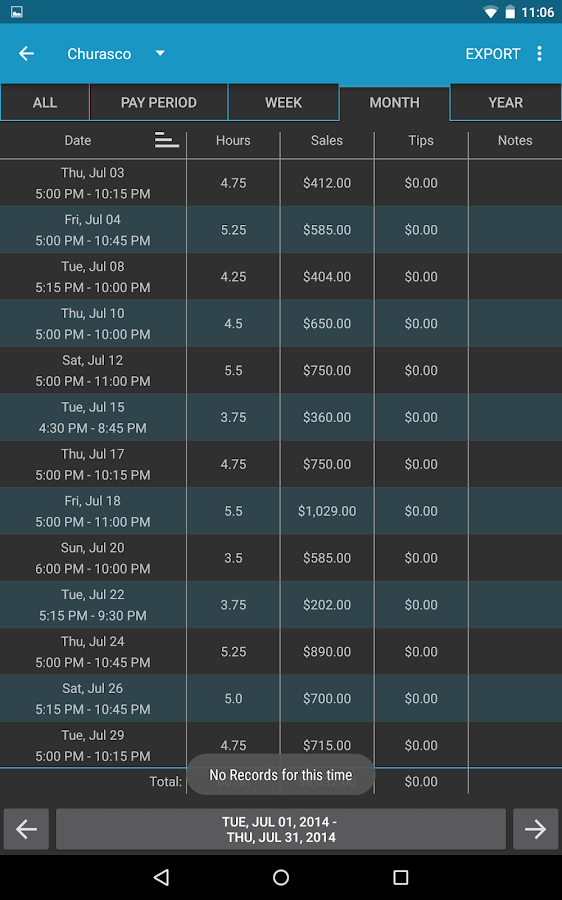 • Export your recorded shifts as a spreadsheet (.CSV) by week, month, year, pay period or all recorded shifts.